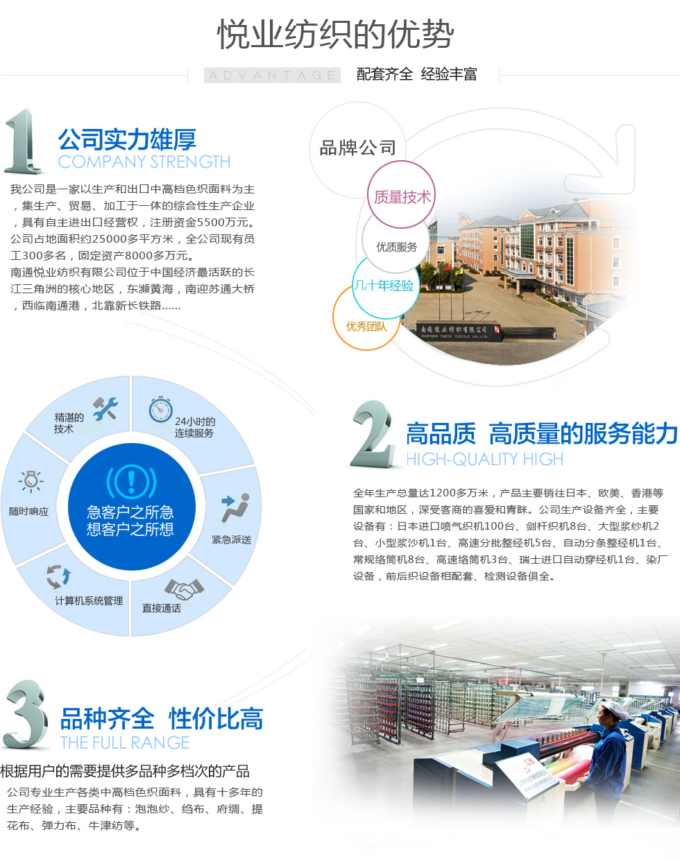 南通悅業(yè)紡織有限公司位于中國(guó)經(jīng)濟(jì)最活躍的長(zhǎng)江三角洲的核心地區(qū)、中國(guó)近代第一城—江蘇省南通市,是一家以生產(chǎn)和出口中高檔色織布為主業(yè)的集生產(chǎn)、貿(mào)易、加工于一體的企業(yè),具有進(jìn)出口經(jīng)營(yíng)權(quán),注冊(cè)資金5500萬(wàn)元。 公司常年生產(chǎn)各類中高檔色織面料,品種有:全棉色織布,cvc、T/C、青年布...